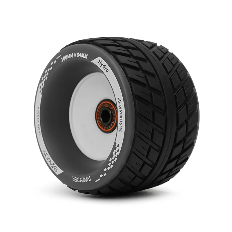 A new level of grip - the Hydro all season tyres are designed to overcome the extreme loss of traction regular urethane wheels experience on damp or uneven terrain. Super durable and grippy rubber wraps around a urethane core for a familiar ride. Channels are cut out in a directional tread pattern to ensure the rubber stays in contact with the ground in all conditions.