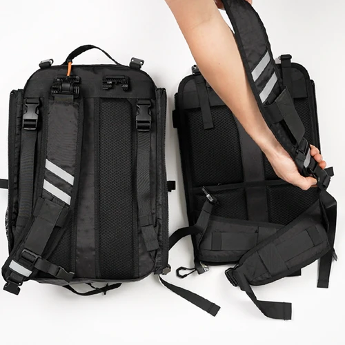 D: Wide shoulder straps + back support + waist belt for more effortless carrying